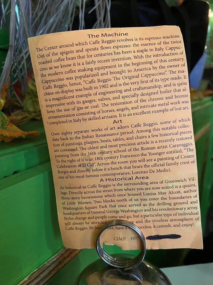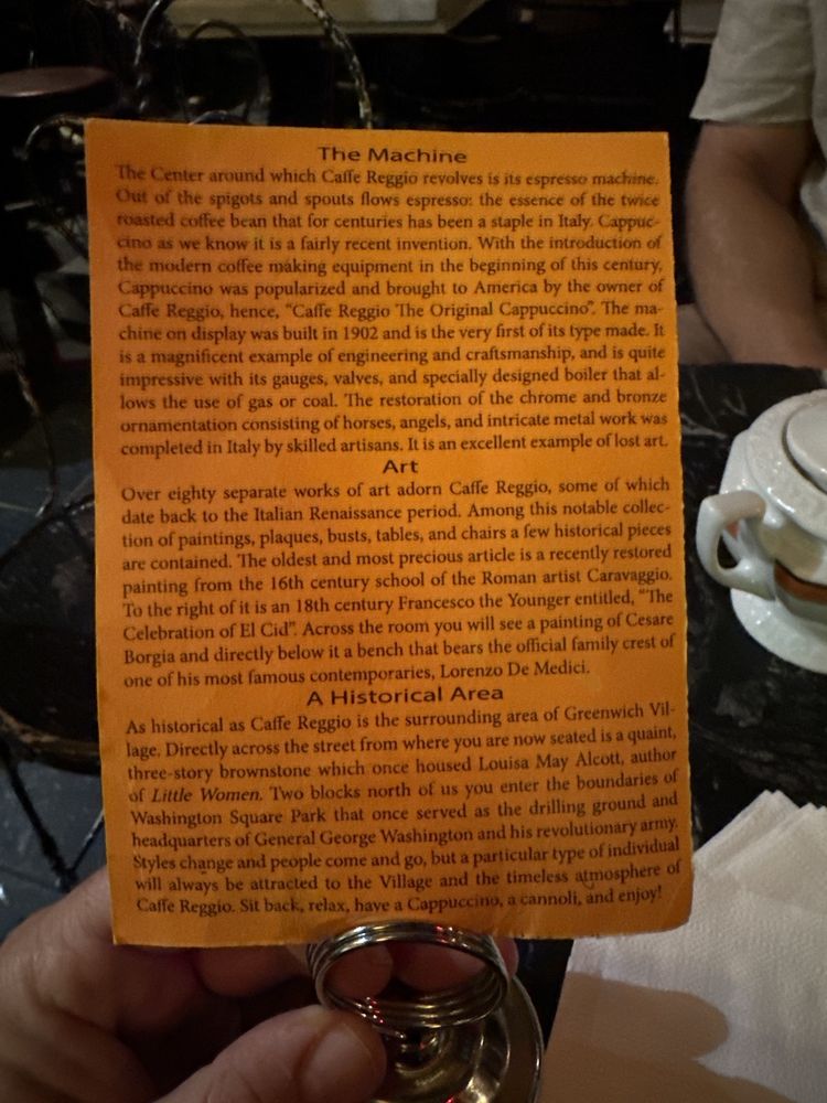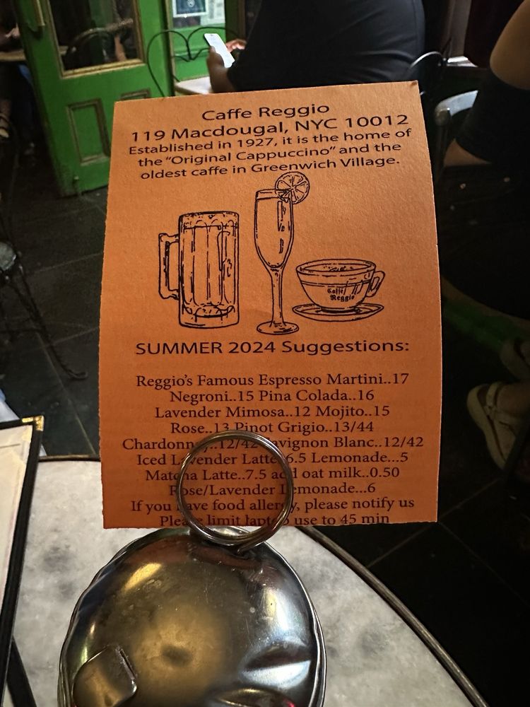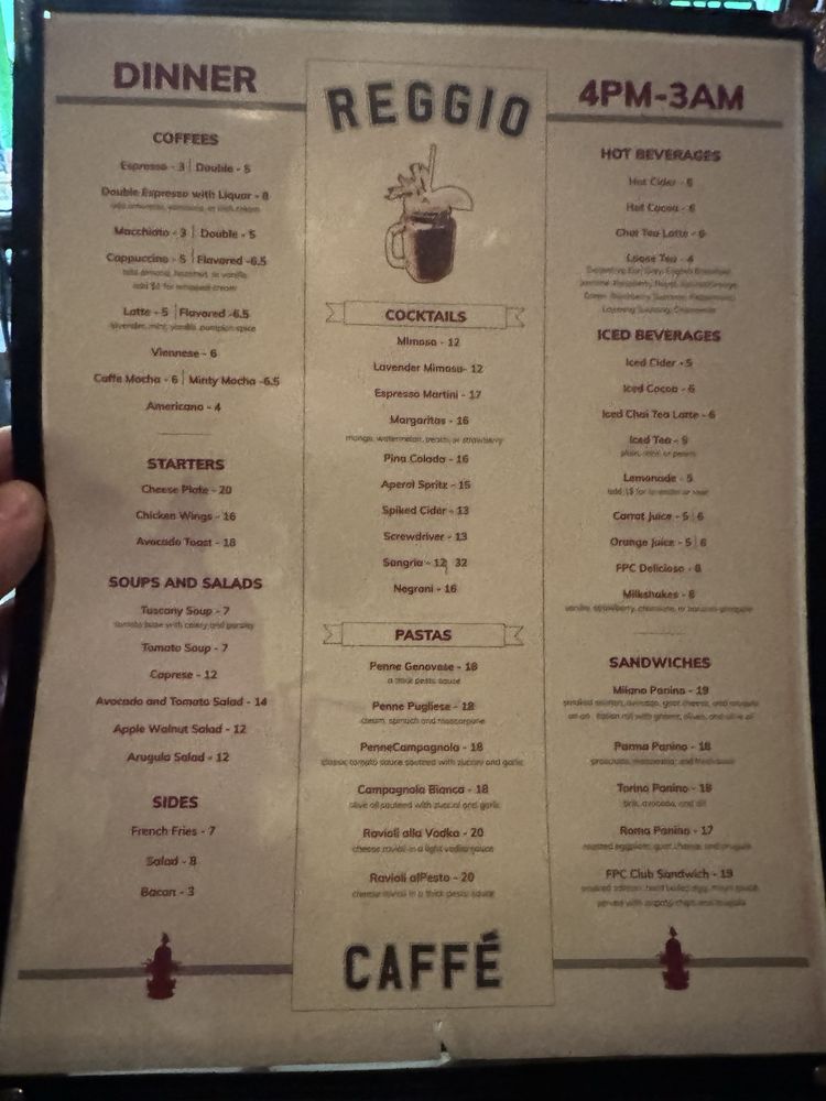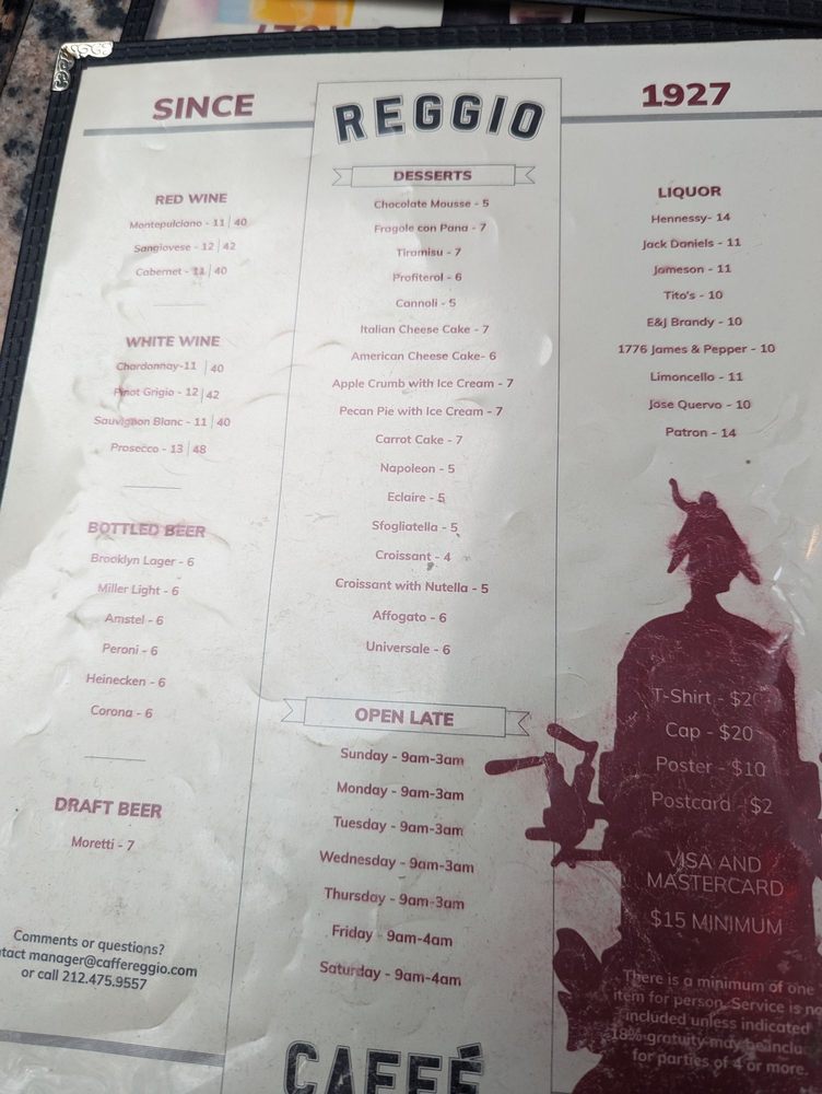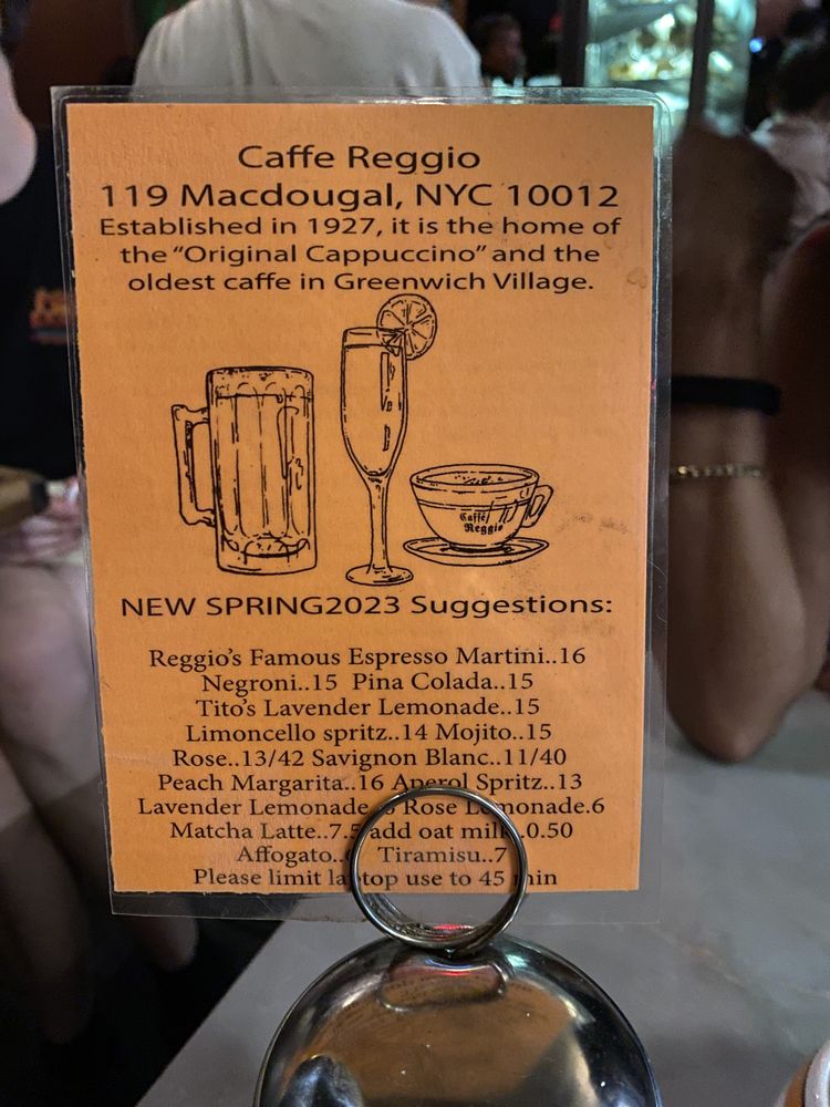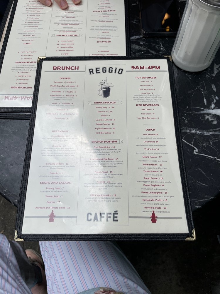Located on 119 MacDougal St in New York's vibrant Greenwich Village, Caffe Reggio is a cherished Italian café renowned for its historical ambiance and delightful menu. Ideal for breakfast and brunch, the café invites patrons to indulge in a variety of dishes that blend authenticity with comfort. Highlights include the Bruschetta, featuring fresh tomatoes and mozzarella, and the refreshing Arugula Salad. For those with a sweet tooth, the classic Affogato and decadent Tartufo are must-tries.